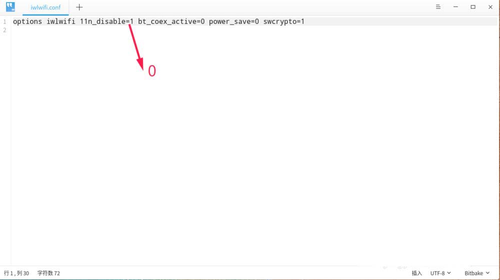 4、將“options iwlwifi 11n_disable=1 bt_coex_active=0 power_save=0 swcrypto=1”中的“11n_disable=1”修改為“11n_disable=0”