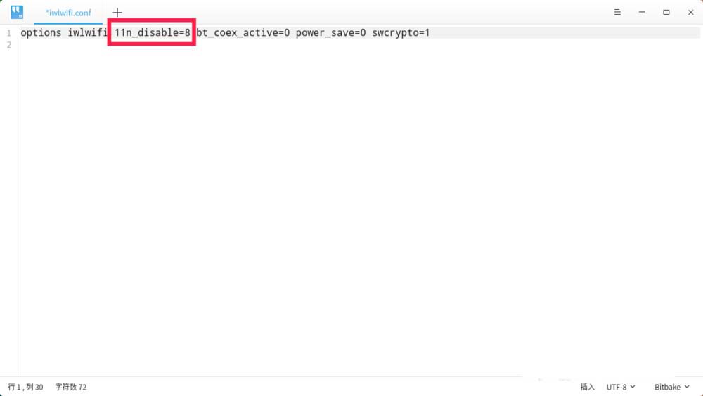 6、如果網(wǎng)速沒有變化的話也可以將:“options iwlwifi 11n_disable=1 bt_coex_active=0 power_save=0 swcrypto=1”中的“11n_disable=1”修改為“11n_disable=8”