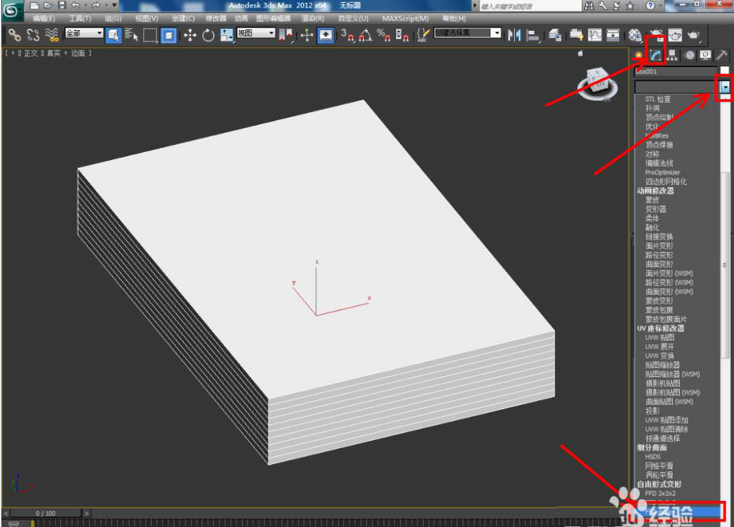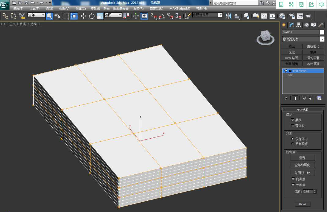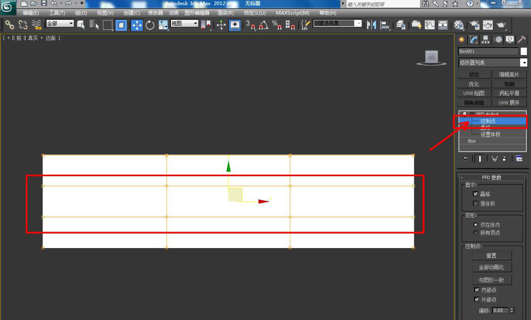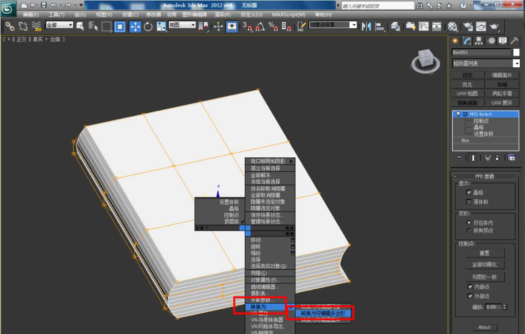 2、點擊【修改】-【修改器列表】-【FFD4*4*4】,為模型添加一個FFD4*4*4;點擊【控制點】,按圖示對模型上的控制點進行調(diào)整,完成書本造型的制作。點擊鼠標(biāo)右鍵-【轉(zhuǎn)換為】-【轉(zhuǎn)換為可編輯多邊形】;