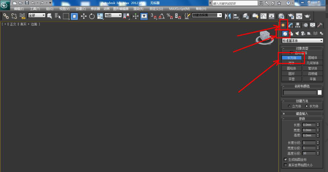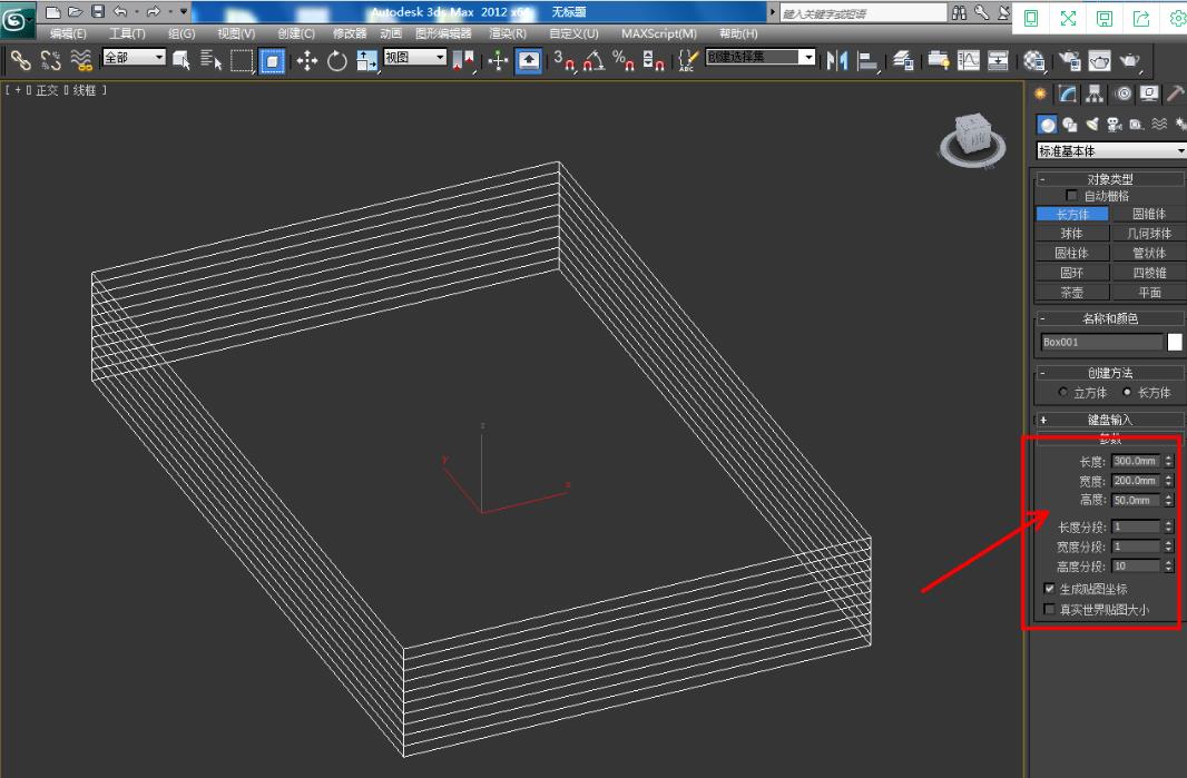 1、打開3Dmax軟件,點擊【創(chuàng)建】-【幾何體】-【長方體】,按圖示參數(shù)繪制出一個長方體模型;