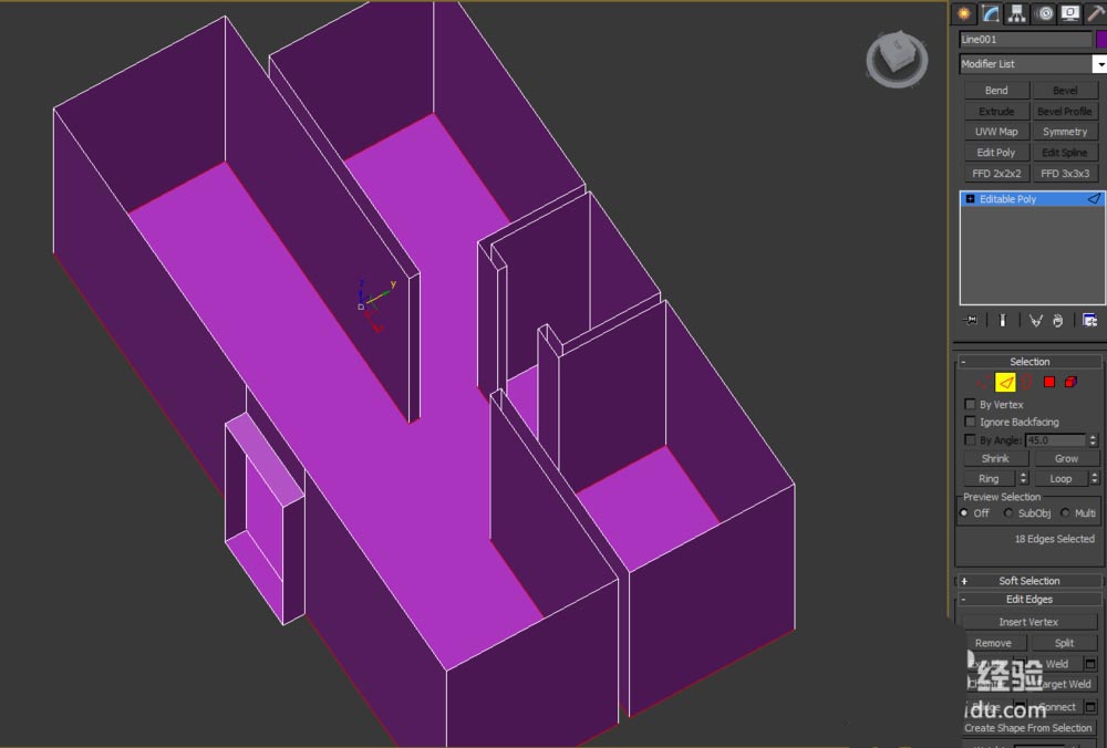 3、選擇模型進(jìn)入修改面板,點(diǎn)擊邊選項(xiàng),選擇需要制作成踢腳線的每條邊;如下: