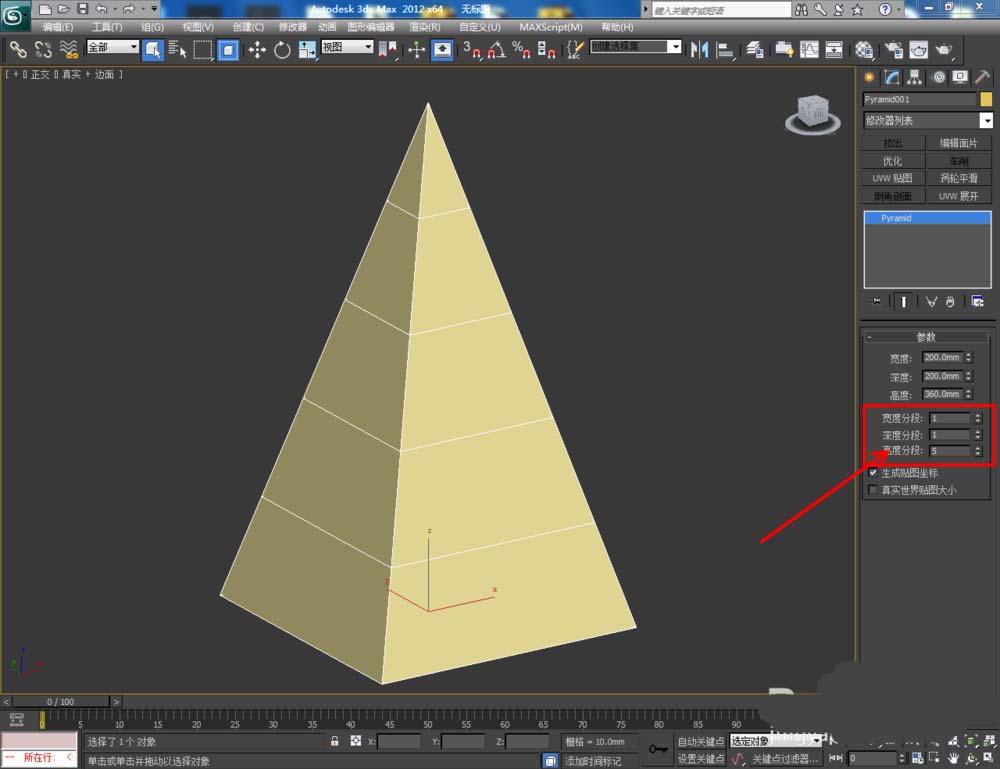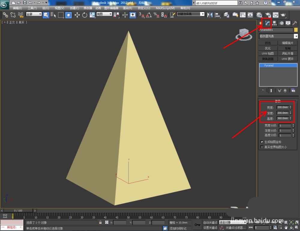 2、選中四棱錐模型,點擊【修改】對四棱錐各個參數(shù)進(jìn)行設(shè)置;