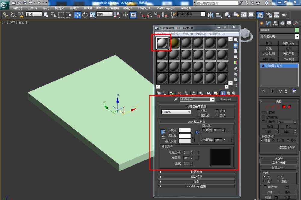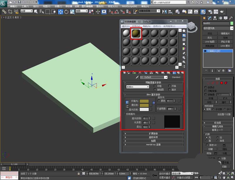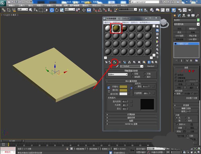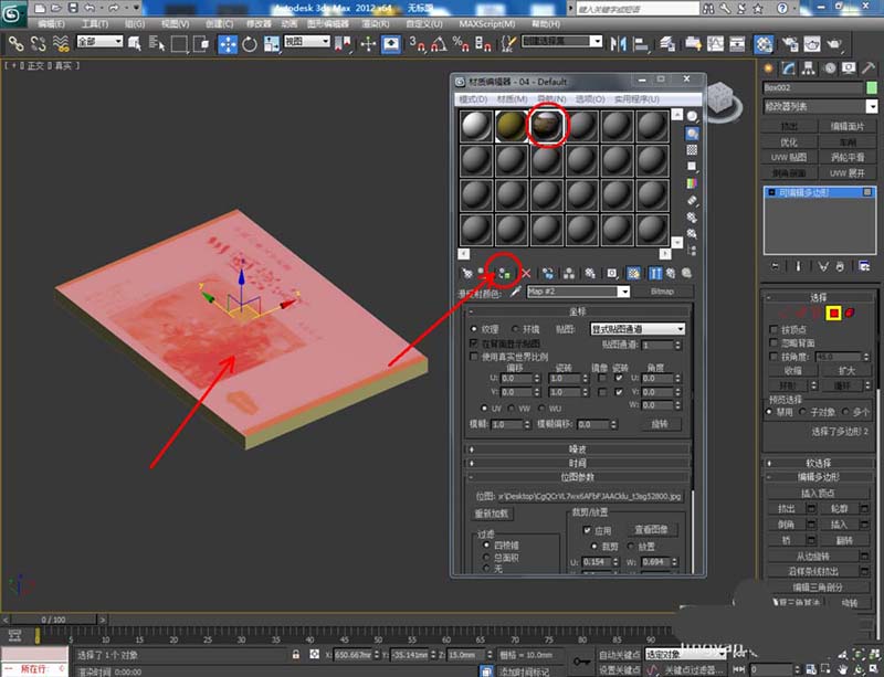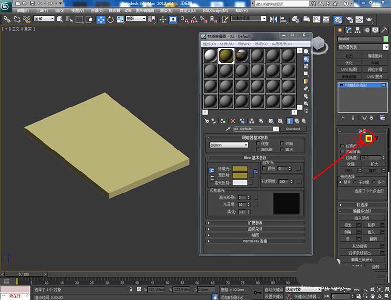 3、選中模型,將墨綠色材質(zhì)球附加給模型后,點(diǎn)擊右邊工作區(qū)中的【面】圖標(biāo),按圖示對(duì)選面進(jìn)行材質(zhì)附加(如圖所示);