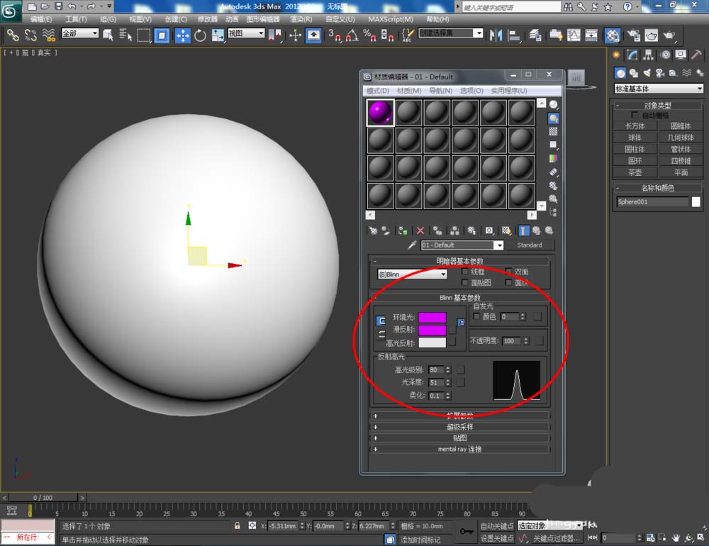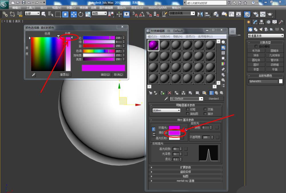 2、點擊【材質(zhì)編輯器】彈出材質(zhì)編輯器設(shè)置欄,按圖示設(shè)置一個洋紅色光面材質(zhì)球并將材質(zhì)球附加給球體模型,這樣我們通過軟件自帶球體工具制作的球體模型就完成了;