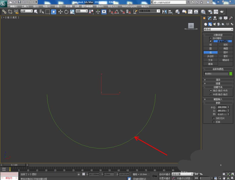 3、點擊【創(chuàng)建】-【圖形】-【圓弧】,按圖示在作圖區(qū)域繪制一個圓弧圖案并按圖示設(shè)置好圓弧的各個參數(shù)。點擊【直線】。選中圖案,點擊【對象顏色】將模型的對象顏色設(shè)置為:白色(如圖所示);
