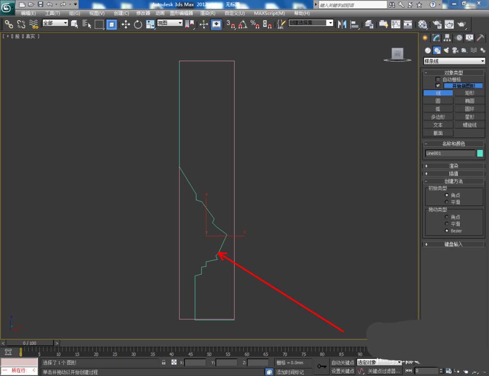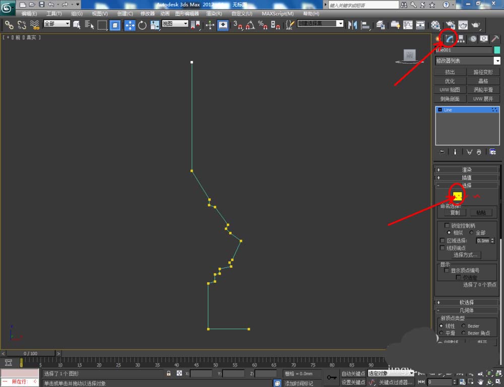 2、點(diǎn)擊【創(chuàng)建】-【圖形】-【線】,以矩形圖案為參數(shù)按圖示繪制一個線段圖案。選中線段圖案,點(diǎn)擊右邊工作區(qū)中的【頂點(diǎn)】,將圖示圖案上的選點(diǎn)進(jìn)行圓化平滑處理(如圖所示);
