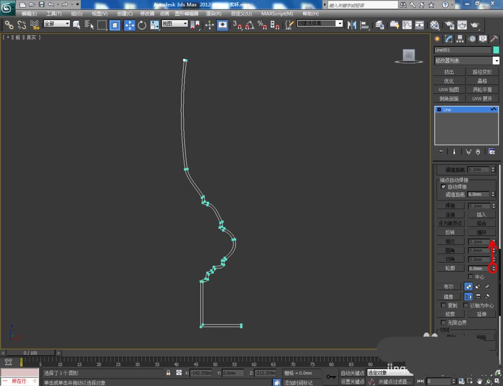3、點(diǎn)擊右邊工作區(qū)中的樣條線,選中整個線條圖案上的樣條線后,鼠標(biāo)向上拉動【輪廓】右邊的小三角,對線條圖案進(jìn)行輪廓處理,完成獎杯截面圖案的制作(如圖所示);