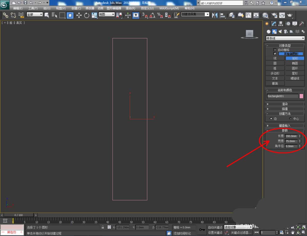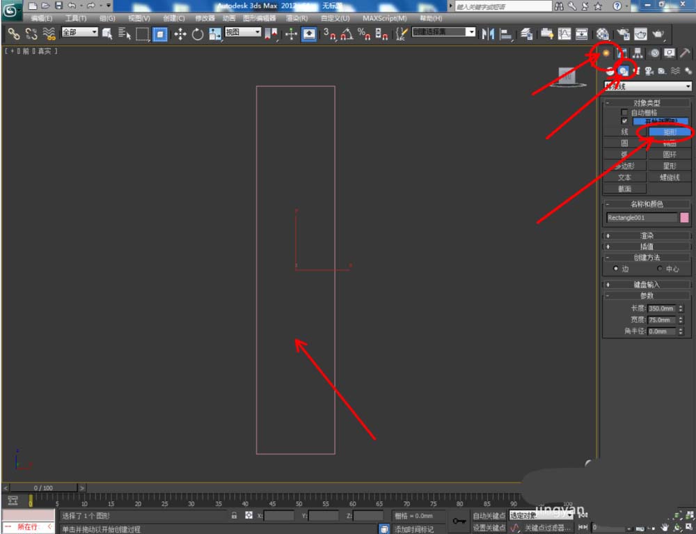 1、打開3Dmax2012軟件,點(diǎn)擊【創(chuàng)建】-【圖形】-【矩形】,在作圖區(qū)域繪制一個參考矩形圖案并按圖示設(shè)置好矩形圖案的各個參數(shù);
