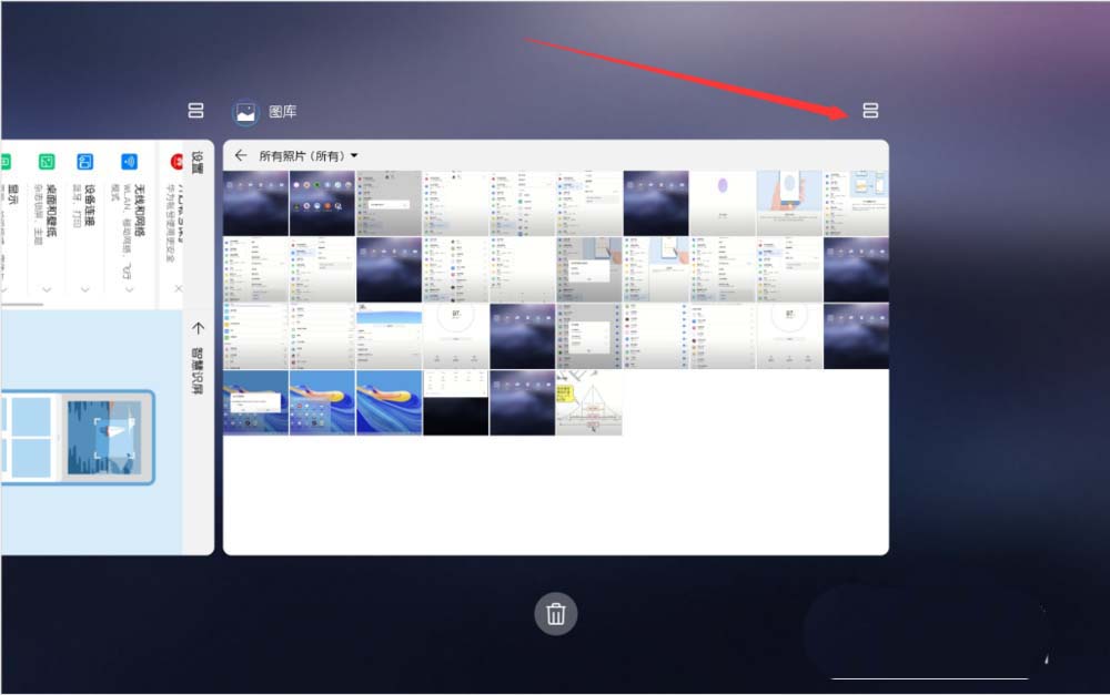 2、滑動(dòng)向上之后會(huì)出現(xiàn)多任務(wù),此時(shí)點(diǎn)擊任務(wù)右上角的小圖標(biāo)如圖所示,這個(gè)是你想分屏的軟件的小圖標(biāo)。