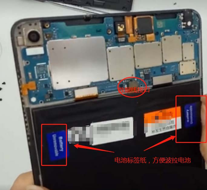 7、然后撥掉上方的電池排線接口,再找到電池背后的兩個標(biāo)簽,撕開,方便拉出電池,如圖所示: