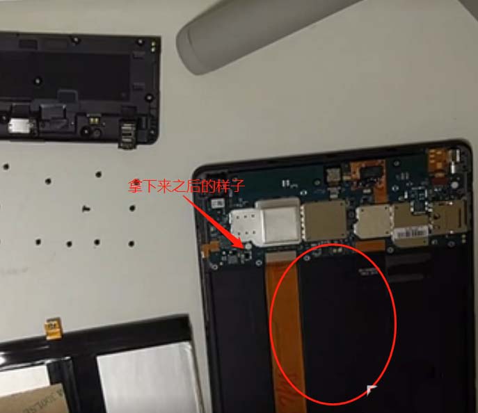 9、拆下來之后,再將新買的電池背面貼好膠布平穩(wěn)放在平板電腦上,然后接好電池數(shù)據(jù)線接口,如圖所示: