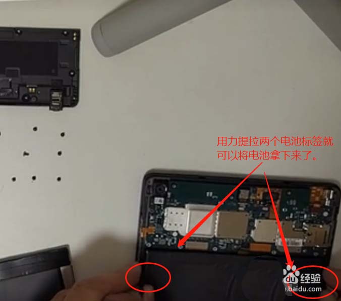 8、用力提拉兩個電池標(biāo)簽,就可以把電池剝下來了,因為背部是用膠水粘著的,如圖所示: