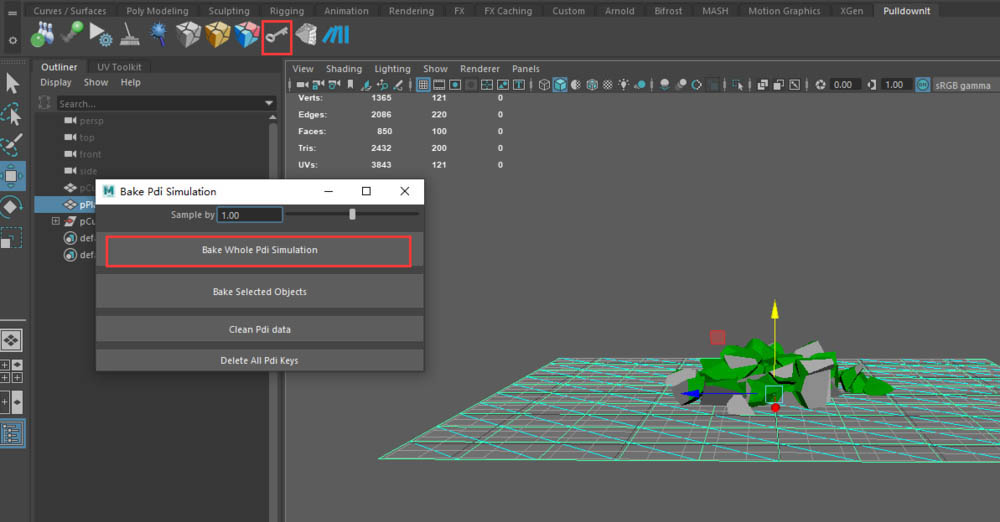 6、點擊鑰匙圖標打開烘焙面板,點擊bake whole pdi simulation 進行全部烘焙