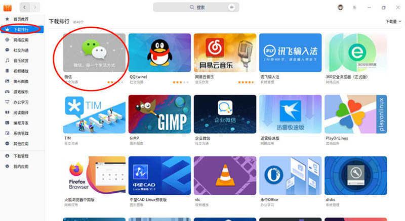 2、在下載排行中找到微信,點擊微信(如果在下載排行中,未找到,可以直接在搜索欄中直接搜索微信)