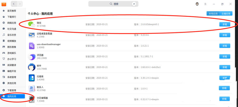 6、點擊應用商店,我的應用,可以看到微信已經(jīng)安裝好了,同時也可以看到已經(jīng)安裝的程序。
