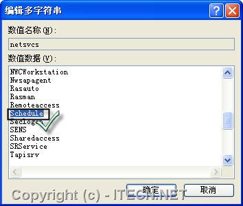 在右側(cè)定位到對(duì)應(yīng)的鍵值,本例是netsvcs,在其數(shù)值數(shù)據(jù)里添加該服務(wù)名即可,本例是Schedule,如圖5所示,并重啟系統(tǒng)。