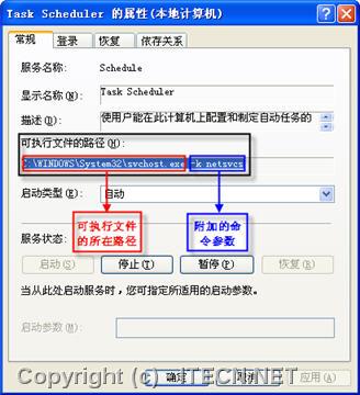 很簡單,首先打開該服務(wù)的屬性對(duì)話框,查看其可執(zhí)行程序的命令參數(shù)(本例是netsvcs),如圖2所示。