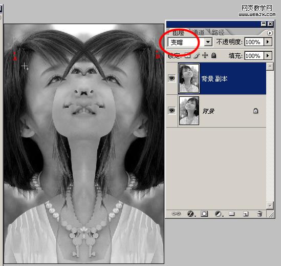 如果有兩個(gè)圖層以變暗模式混合,在a點(diǎn),由于混合色(上圖層)要比基色(下圖層)暗,因此a點(diǎn)的結(jié)果色表現(xiàn)出了上圖層的特點(diǎn),而b點(diǎn),由于混合色要比基色亮,因此b點(diǎn)表現(xiàn)出下圖層的特點(diǎn)。(因?yàn)槭请S手找的圖,所以有點(diǎn)唐突美人了,她的面部特征在變暗模式下顯得異??植溃垂倌郑?br />